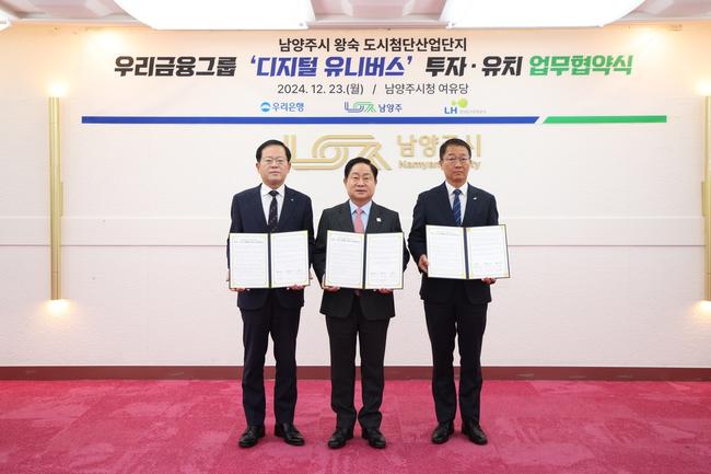 남양주시(시장 주광덕)는 23일 시청에서 ㈜우리은행 및 한국토지주택공사(LH)와 함께 우리금융그룹 미래형 통합 IT센터 `디지털 유니버스` 건립을 위한 업무협약(MOU)을 체결했다.