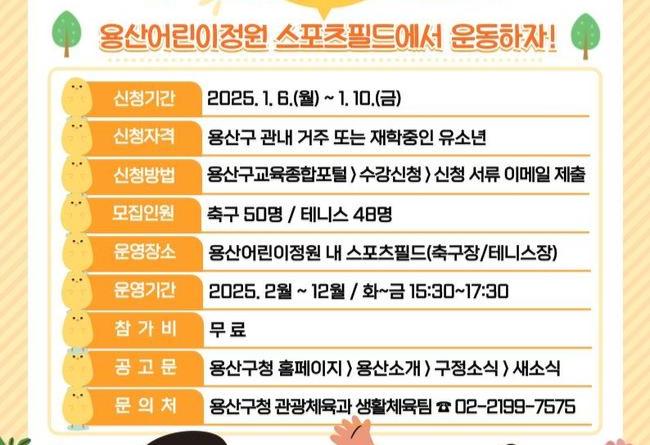 모집은 2025년 1월 6일부터 1월 10일까지 진행된다. 대상은 지역 내 거주 또는 재학 중인 유소년이며, 용산구교육종합포털에서 선착순으로 신청할 수 있다. 신청 후에는 신청서와 증빙서류를 구청 담당자 메일로 제출해야 한다.