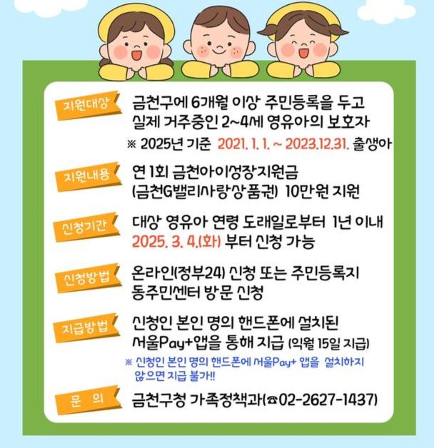 지원대상은 신청일 기준 6개월 전부터 계속해 금천구에 주민등록을 두고 실제 거주하는 2021년 1월 1일부터 2023년 12월 31일까지 출생한 영유아의 보호자이다.