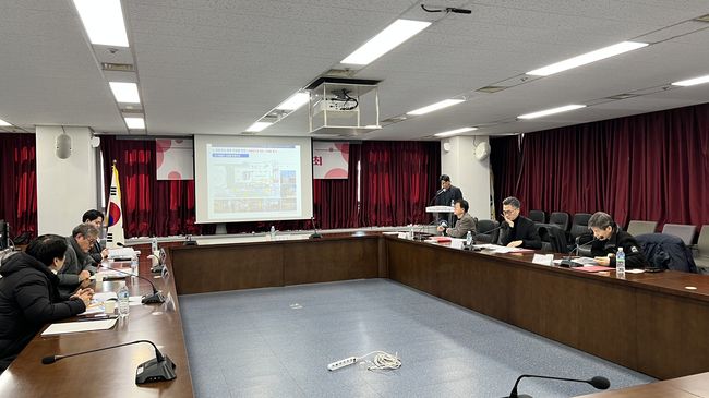 창동역 동측 거리가게 환경개선사업 특별전담팀이 1차 회의에서 앞으로의 추진사항 등에 대해 논의하고 있다(2025. 2. 21. 도봉구청 10층 간송홀)