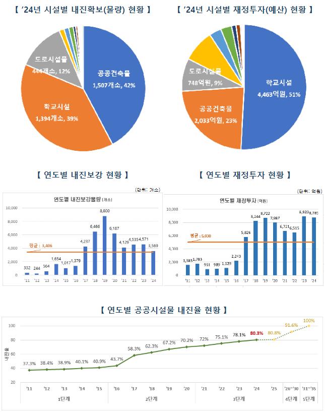 공공시설물 내진율은 대책이 처음 수립된 2011년 37.3%에서 2016년 43.7%, 2021년 72.0%로 지속적으로 상승해왔으며, 올해 80.3%에 도달했다. 정부는 오는 2035년까지 내진율 100% 달성을 위한 장기계획을 수립하고 3조5,543억 원을 투입할 계획이다.