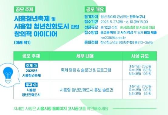 시흥시(시장 임병택)는 5월 27일부터 `2025 시흥청년축제 아이디어 공모전`을 개최한다.
