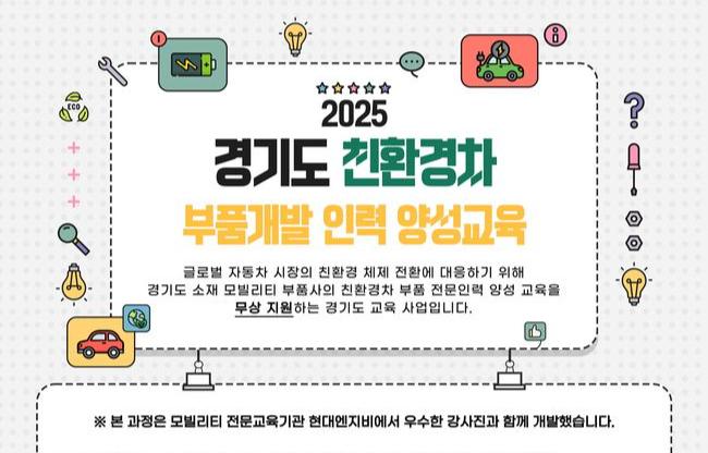 경기도와 경기테크노파크는 ‘2025년 경기도 친환경차 부품개발 인력양성 교육’을 통해 미래 모빌리티 시대에 대응할 전문인력 양성에 나선다. 이를 위해 도는 총 15억 원의 예산을 편성하고, 도내 자동차 부품기업의 친환경차 생태계 진입을 적극적으로 지원할 계획이다.