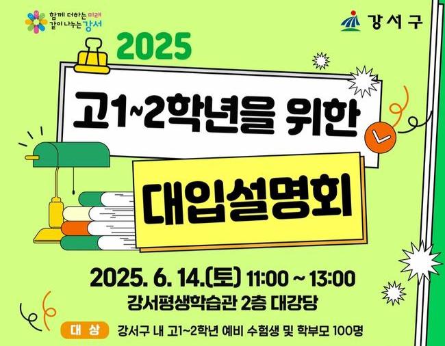 서울 강서구(구청장 진교훈)는 고등학교 1·2학년을 위한 2027∼2028학년도 대학 입시설명회를 오는 14일 개최한다고 밝혔다.
