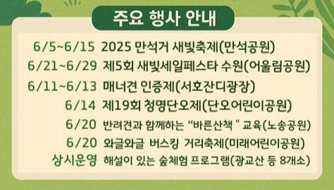 6월 5∼15일 장안구 만석공원에서 `2025 만석거 새빛축제`, 6월 14일 영통구 단오어린이공원에서 제19회 청명단오제, 6월 20일 영통구 미래어린이공원에서 와글와글 버스킹 거리축제, 6월 21∼29일 권선구 어울림공원에서 제5회 새빛세일페스타 수원이 열린다.