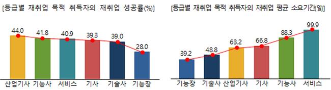 2023년 국가기술자격 취득자 61만 명 가운데 이·전직을 목적으로 응시한 응답자는 약 2만4천 명(3.9%)이었으며, 이들 중 41.1%가 재취업에 성공, 평균 소요기간은 78.9일로 집계됐다. 자격 등급별로는 산업기사(44.0%), 기능사(41.8%), 서비스 분야(40.9%)가 상위권을 차지했으며, 가장 빠른 재취업 소요기간은 기능장(39.2일)으로 조사됐다.