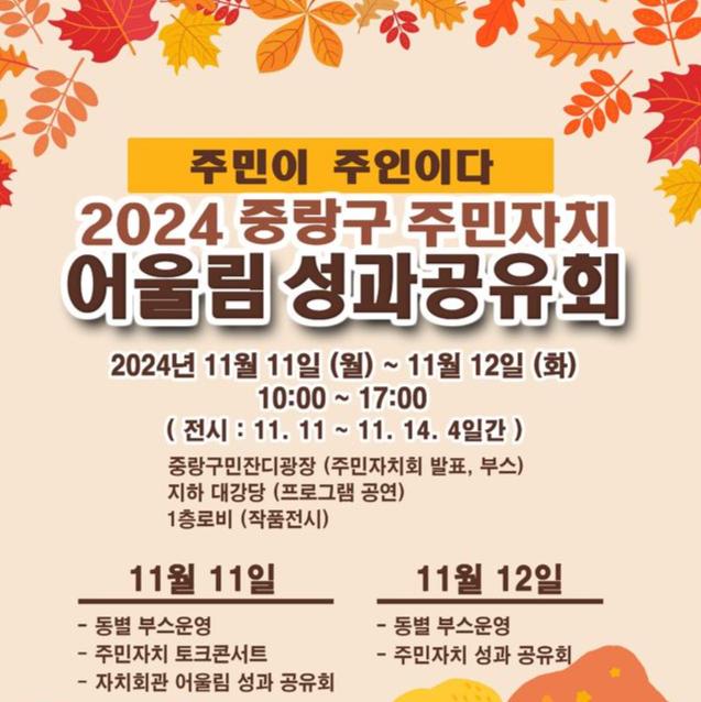 중랑구가 오는 11일부터 12일까지 이틀간 구청 잔디광장 및 1층 로비, 지하 대강당에서 ‘중랑구 주민자치 어울림 성과공유회’를 개최한다. 이번 성과공유회는 중랑구 주민자치회 활동을 널리 알리고, 우수 사례를 공유하여 주민자치에 대한 주민들의 관심과 참여를 높이기 위해 마련되었다.