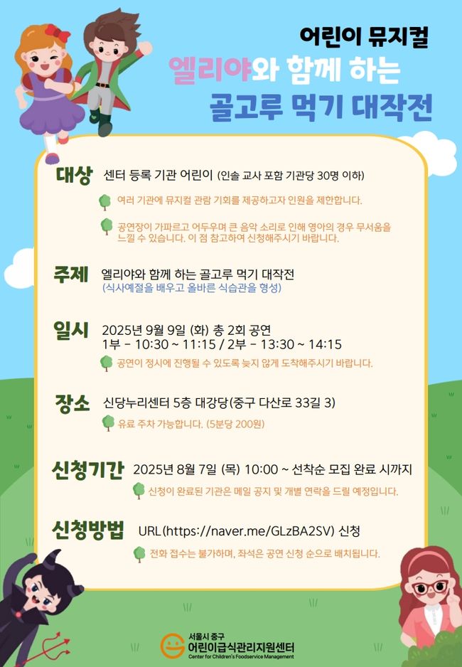 서울 중구, 어린이 식습관 개선 뮤지컬 무료 공연 - 9월 9일 신당누리센터 대강당서 두 차례 공연 - 스트릿댄스·레이저쇼 결합해 흥미와 교육 효과 강화 - 관내 어린이집·유치원 대상 선착순 모집 진행 중