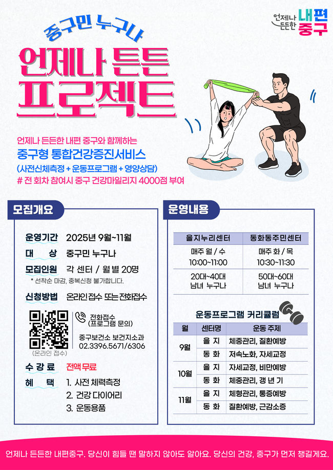 서울 중구가 구민 모두가 체감할 수 있는 맞춤형 건강증진 통합관리 서비스 <중구민 누구나 언제나 튼튼 프로젝트>를 하반기 시범사업으로 본격 추진한다.