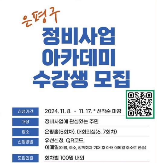은평구는 오는 17일까지 정비사업에 관심 있는 구민을 대상으로 ‘2024년 하반기 은평구 정비사업 아카데미 수강생’을 모집한다고 밝혔다.