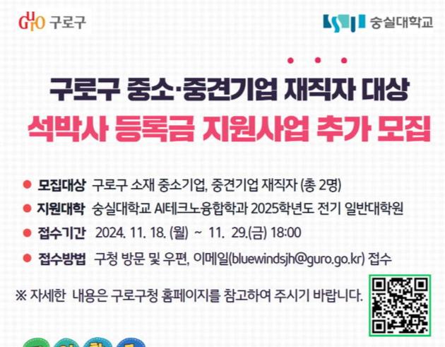 구로구, 중소·중견기업 재직자 대상 석박사 등록금 지원사업 장학생 추가 모집 - 이달 29일까지 구청 일자리지원과 방문·우편·이메일 접수 - 숭실대 AI테크노융합학과 석·박사 과정, 연간 최대 1천만 원 등록금 지원