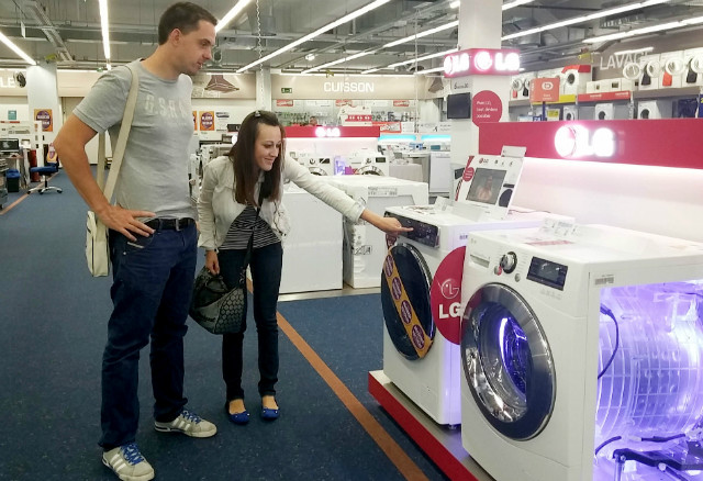 프랑스 파리 시내 전자매장을 찾은 고객들이 에너지효율, 디자인을 강화한 LG 드럼세탁기 신제품을 둘러보고 있다.