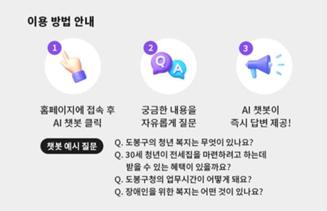 도봉구가 24시간 시공간 제약 없이 구민과 공무원이 행정 서비스를 이용할 수 있도록 인공지능(AI) 챗봇 서비스를 도입했다.