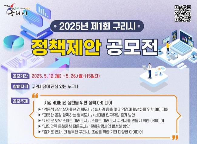 구리시(시장 백경현)는 `즐거운 변화, 더 행복한 구리시`를 만들고자 구리시정 4대 비전을 주제로 5월 12일부터 26일까지 15일간 `2025년 제1회 구리시 정책 제안 공모전`을 개최한다.