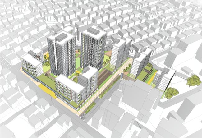 특히 표고 차이가 15m에 달하는 분지 형태로 동서간 보행이 단절된 문제 해결에 중점을 뒀다. 지형에 순응한 단지와 공공보행통로를 계획하고, 지형 레벨을 활용한 저층부 공간은 주민공동이용시설과 커뮤니티시설로 구성한다. 인근 용왕산근린공원과 연결되는 열린 보행네트워크를 조성해 접근성을 높인다.