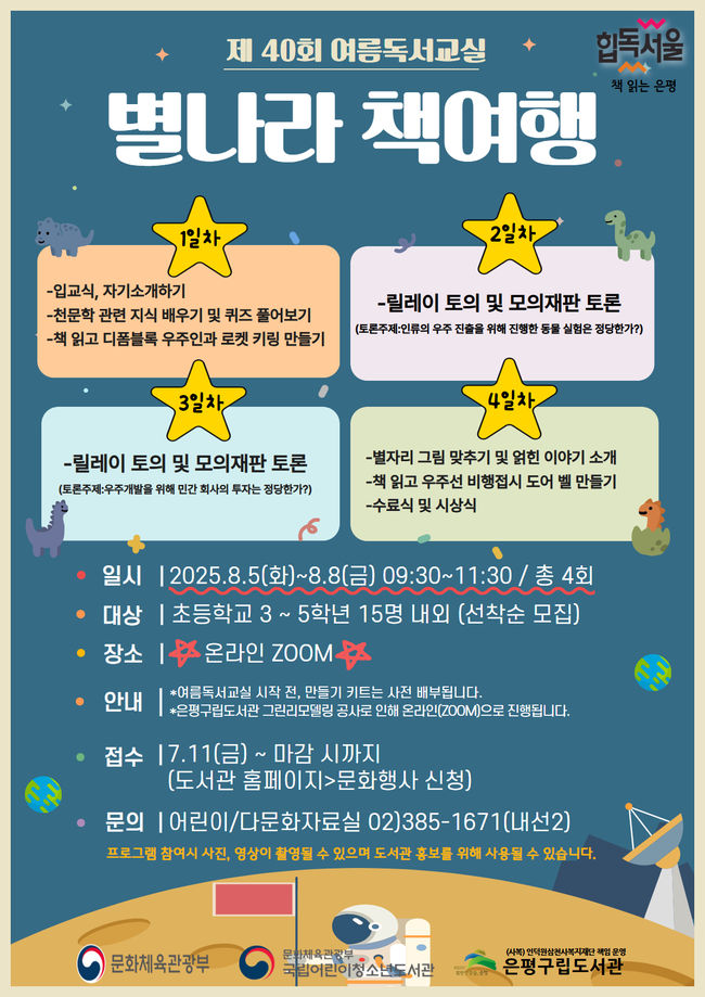 은평구립도서관, 초등생 대상 `여름 독서 교실` 운영 - 8월 5일부터 8일까지 온라인으로 ‘별나라 책 여행’ 진행 - 토론·모의재판·우주선 만들기 등 융합형 독서 체험 마련 - 국립어린이청소년도서관장상 포함 우수 참여자 시상도