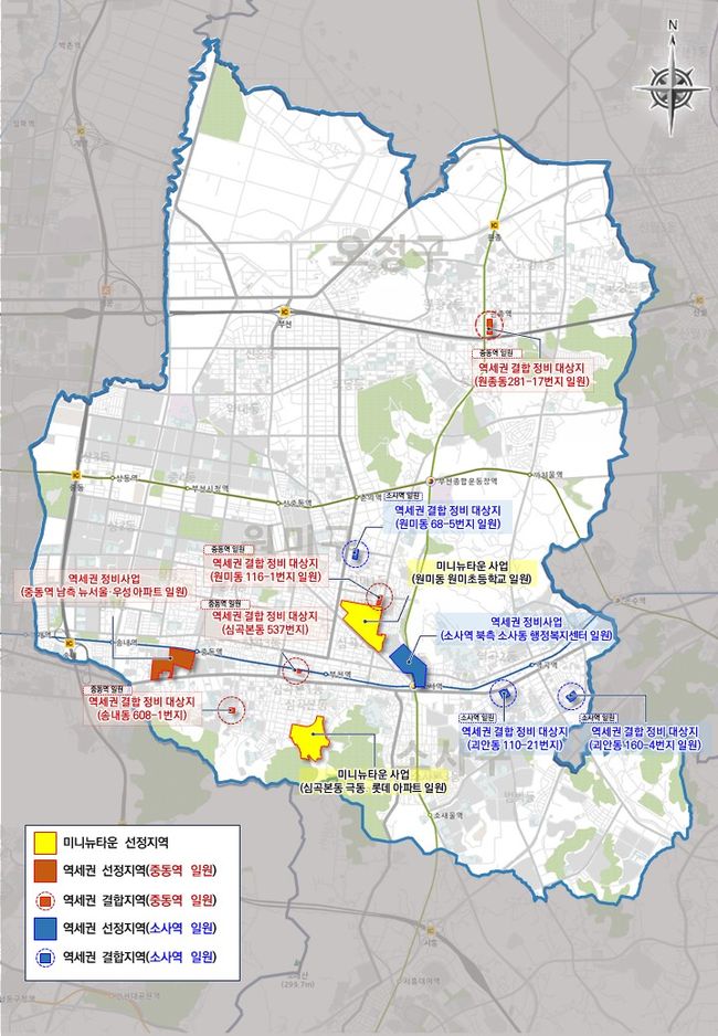 미니뉴타운 · 역세권 정비사업 공모 선정 대상지.부천시는 이번 공모를 통해 총 7개 지구를 사업대상지로 선정했다고 밝혔다. 민간 제안에 따라 추진되는 `미니뉴타운 정비사업`은 중동 1150번지, 심곡본동 547번지, 송내동 369번지 일원 3곳이 뽑혔고, 시가 직접 주도하는 ‘부천형 역세권 정비사업’은 소사역, 부천역, 중동역, 역곡역 주변 4곳이 확정됐다.