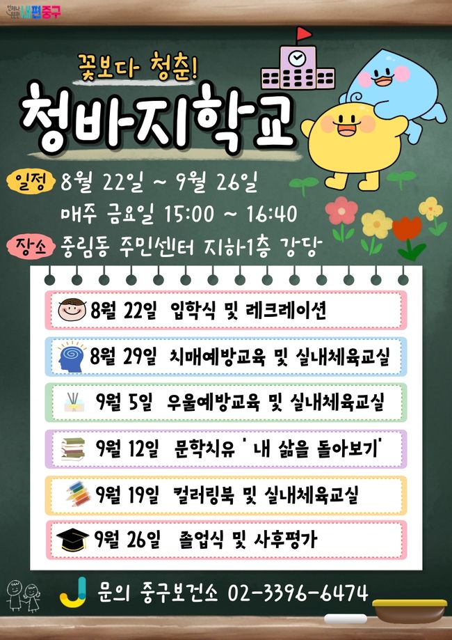 서울 중구, 어르신 맞춤형 건강 프로그램 ‘청바지학교’ 신입생 모집 - 8월 22일부터 6주간 중림동주민센터서 진행 - 인지활동·근력운동·문학치유 등 신체·정신 건강 균형 강화 - 졸업생 대상 건강소모임 운영으로 지속적 관리 지원