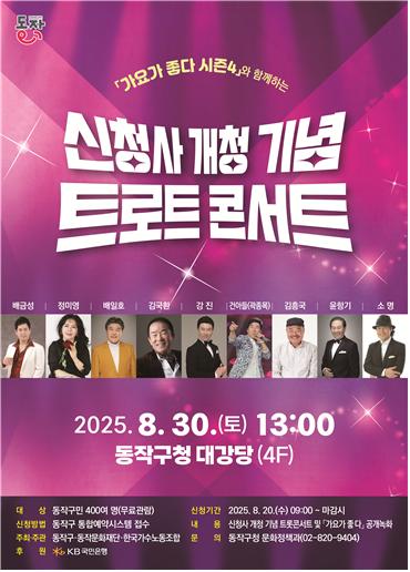 콘서트는 동작구와 동작문화재단, 한국방송가수노동조합이 공동 주관하며, 트로트 전문 방송 프로그램 ‘가요가 좋다 시즌4’ 공개 녹화와 연계해 진행된다.