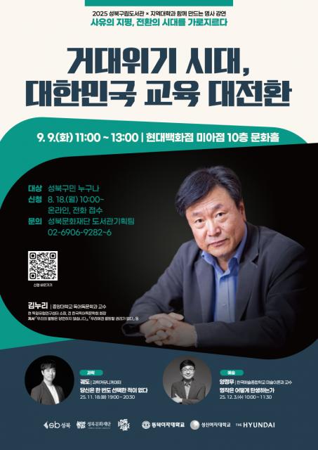 성북문화재단(대표이사 서노원)이 지역 대학과 협력해 명사 강연 시리즈 ‘사유의 지평, 전환의 시대를 가로지르다’를 개최한다. 이번 강연은 성북구민과 대학 구성원이 함께 사유하고 소통하는 장을 마련해, 우리가 맞닥뜨린 시대적 과제를 성찰할 기회를 제공한다.