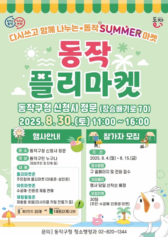 동작구, 30일 ‘동작 플리마켓’ 개최…재활용과 나눔의 장 - 플리마켓·아트마켓·체험활동존으로 다채롭게 구성 - 주민수거보상제 홍보·힐링 피크닉존도 운영 - 30팀 주민 직접 참여, 중고물품 거래와 친환경 체험 기회