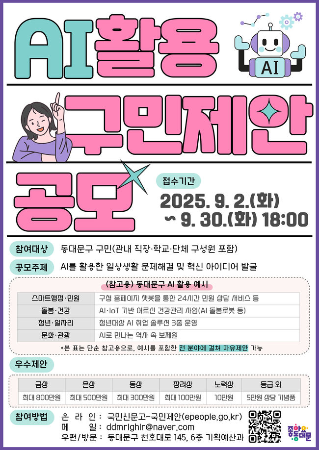 서울 동대문구(구청장 이필형)는 구정 혁신과 생활 밀착형 행정을 강화하기 위해 9월 2일부터 30일까지 「AI 구민제안 집중공모」를 실시한다고 밝혔다.