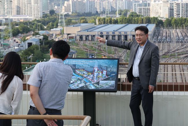 창동차량기지를 바라보며 설명하는 오승록 노원구청장
