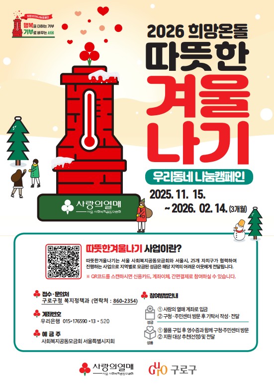 구로구, ‘2026 희망온돌 따뜻한 겨울나기’ 시작 - 11월 15일부터 내년 2월 14일까지 3개월간 추진 - 성금·성품 기부 통해 저소득층 지원 재원 마련 - 지역사회보장협의체 위원, 나눔 홍보대사로 위촉