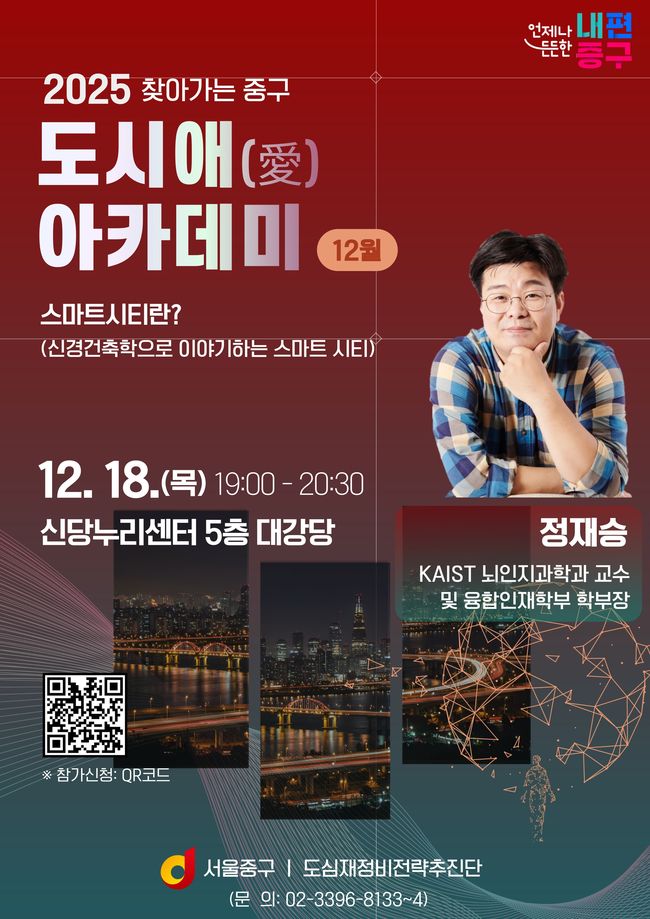 중구, 정재승 교수 초청해 올해 마지막 ‘도시애 아카데미’ 개최 - 스마트시티와 신경건축학 주제로 주민과 소통 - 정재승 교수 강연으로 연중 프로그램 마무리 - 내년에도 심화된 도시 강좌로 확대 운영
